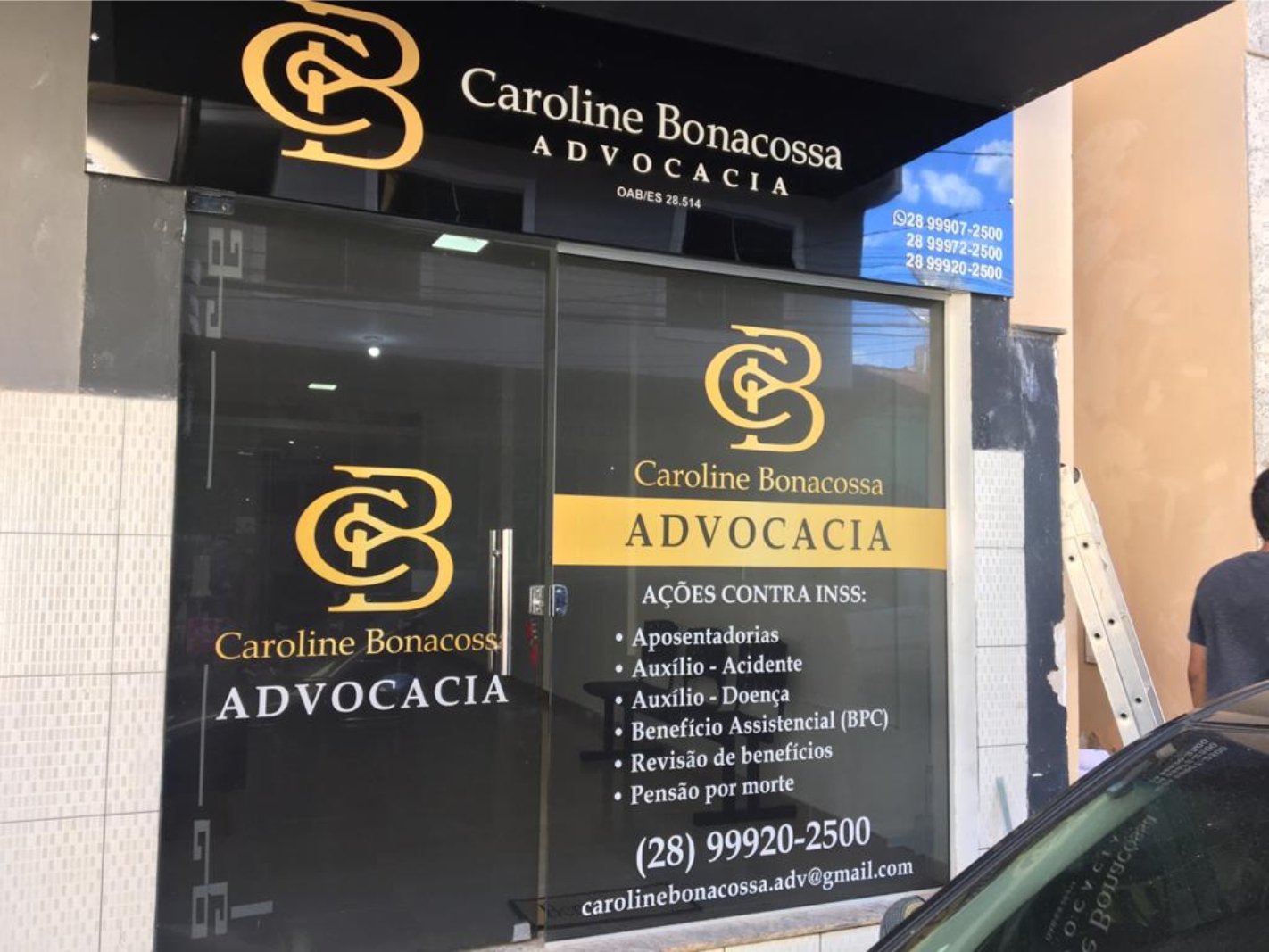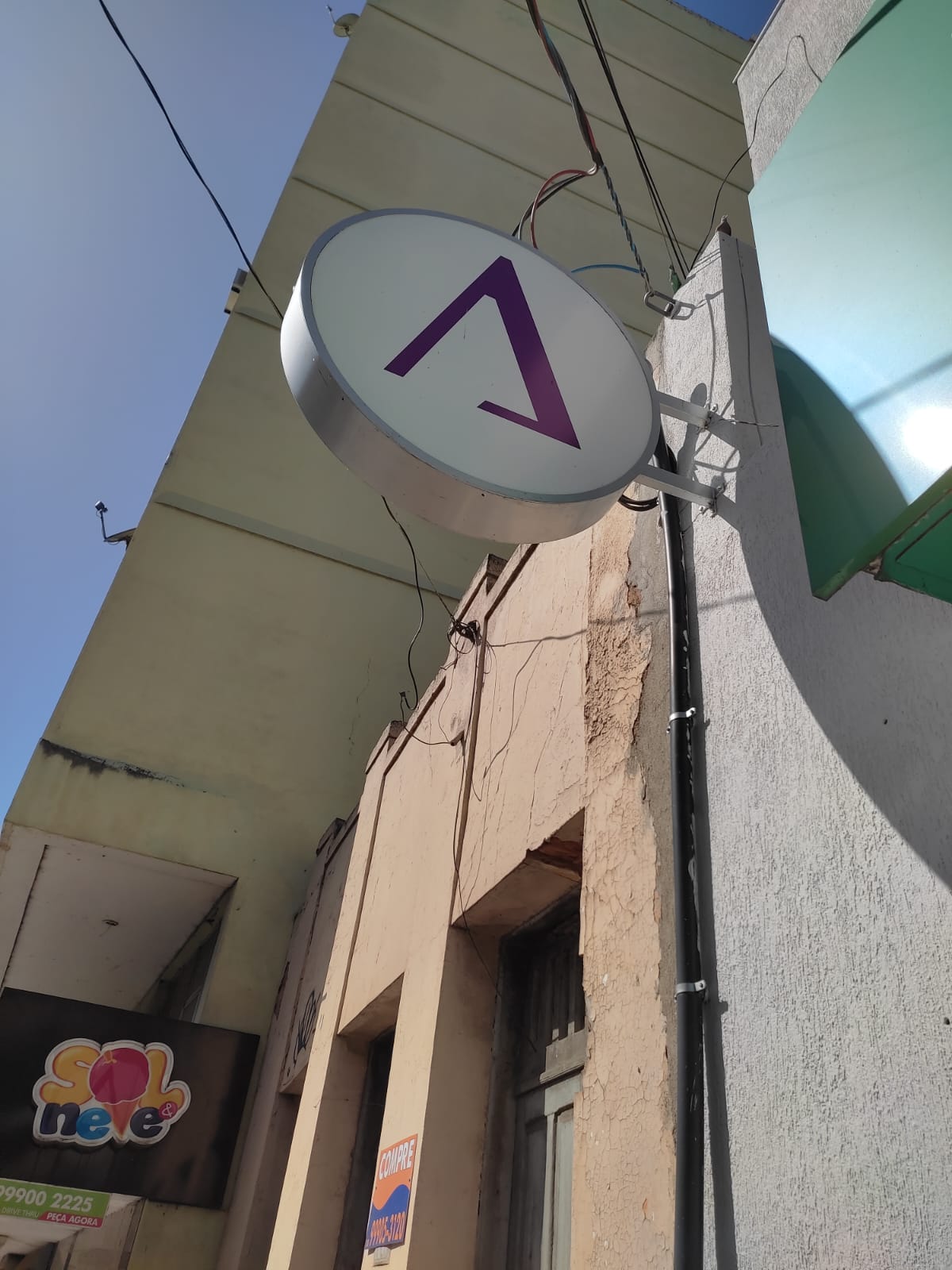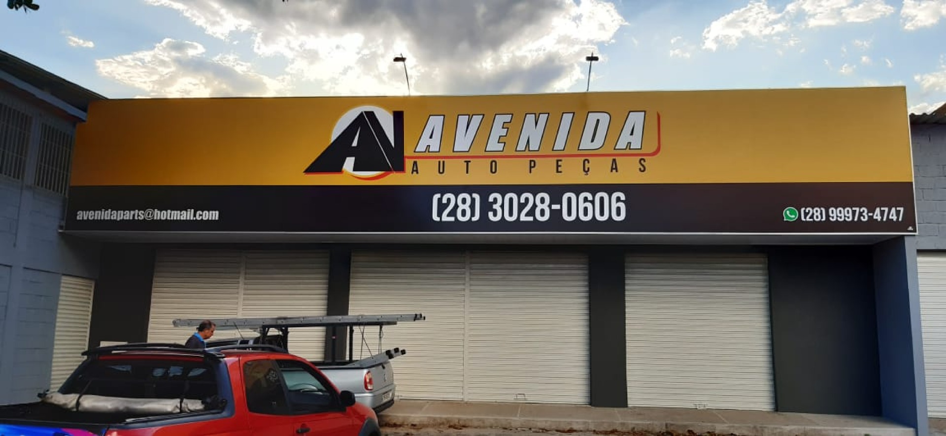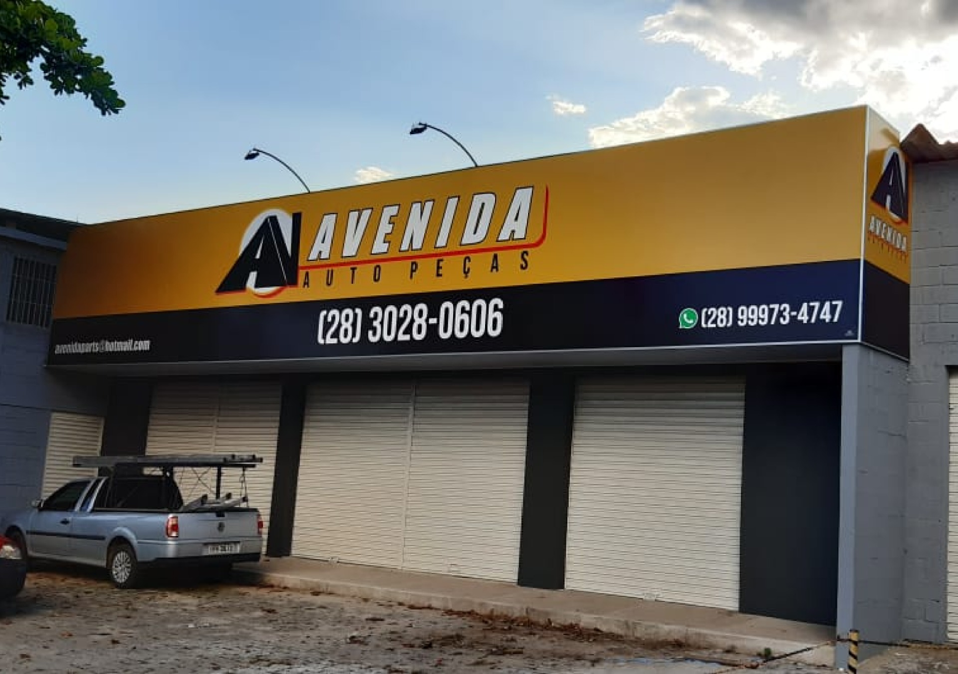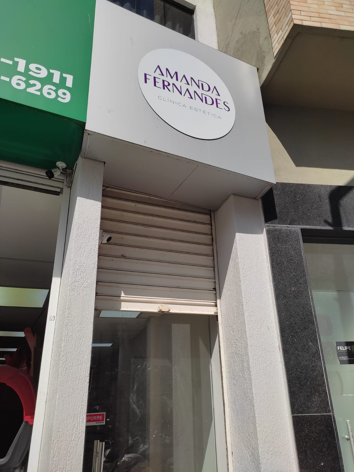 Fachada com painel em ACM e logo em caixa de ACM com iluminação interna. Adesivo fosco no vidro