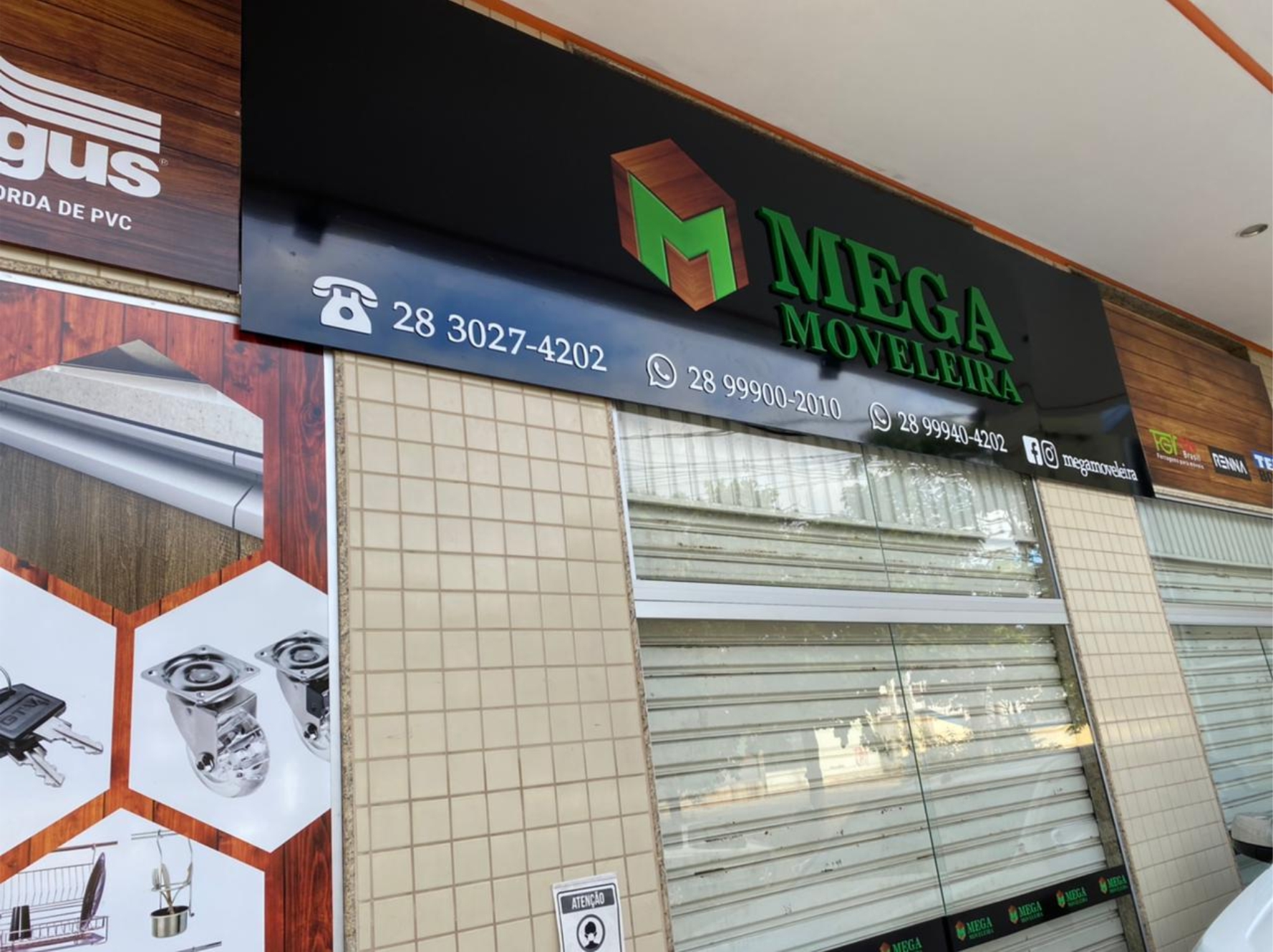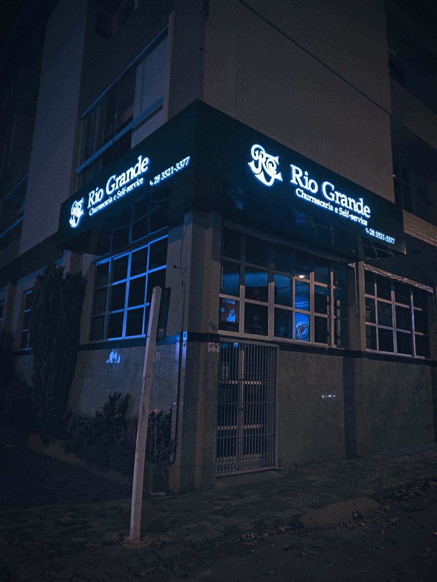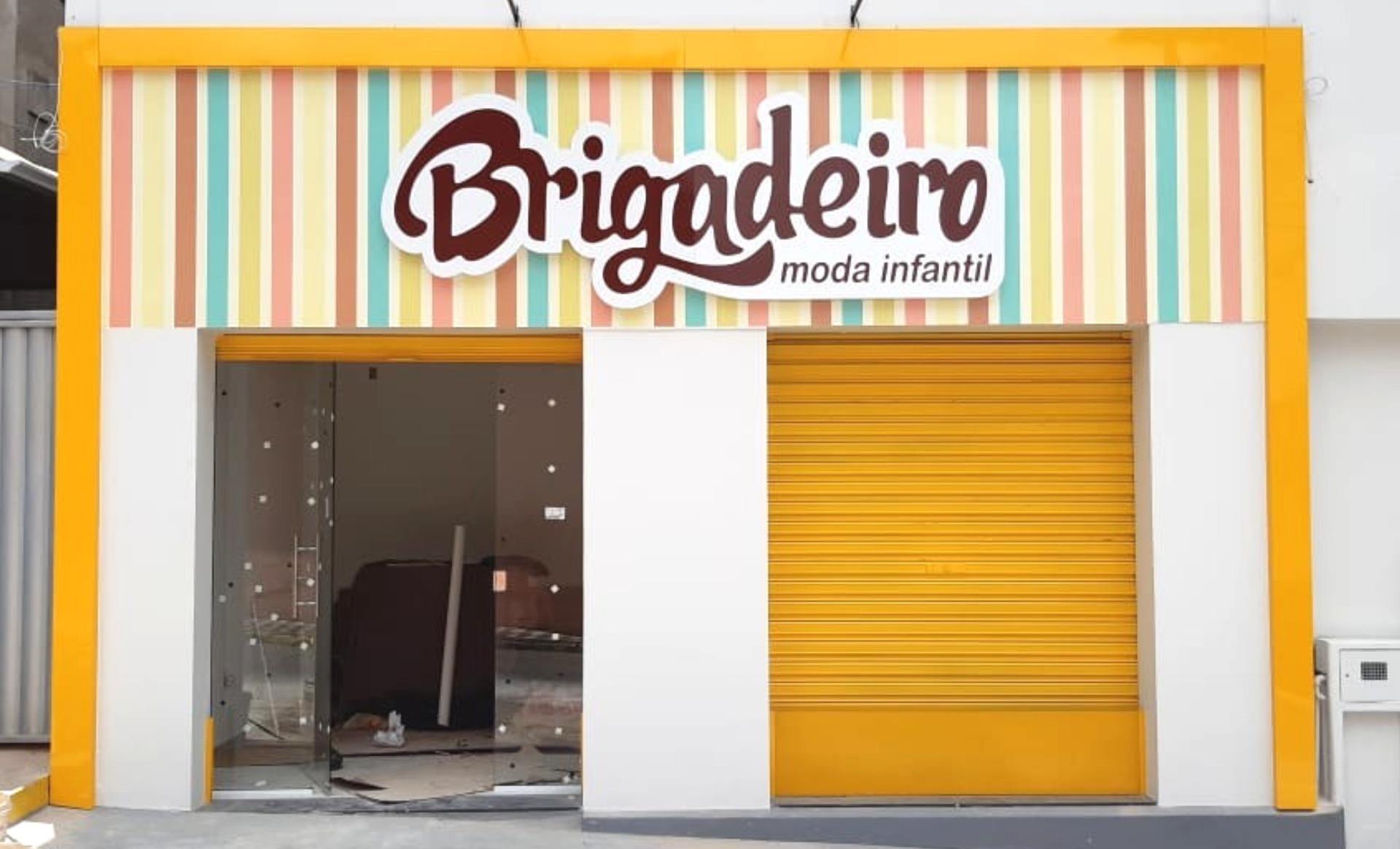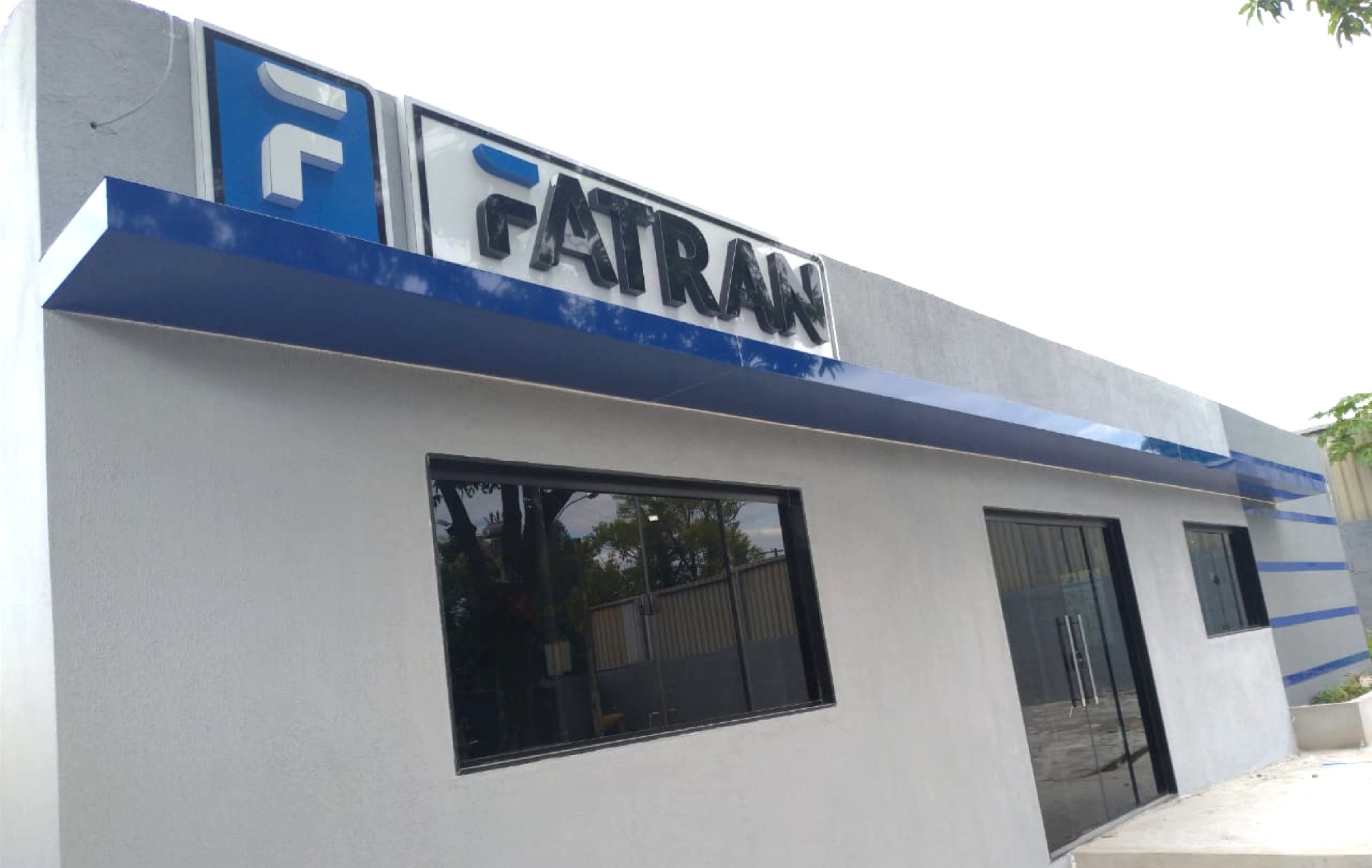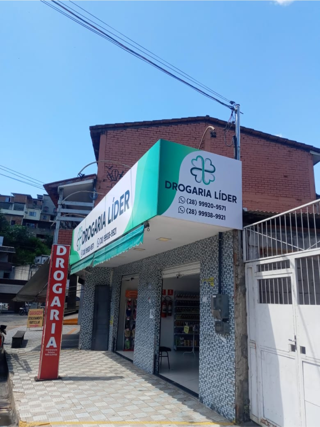 Fachada com painel em ACM e logo em caixa de ACM com iluminação interna. Adesivo fosco no vidro