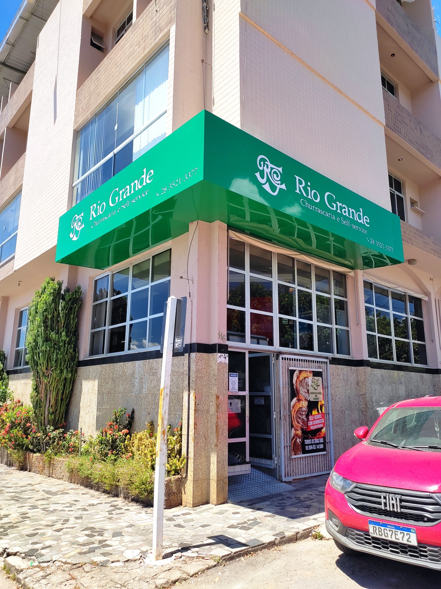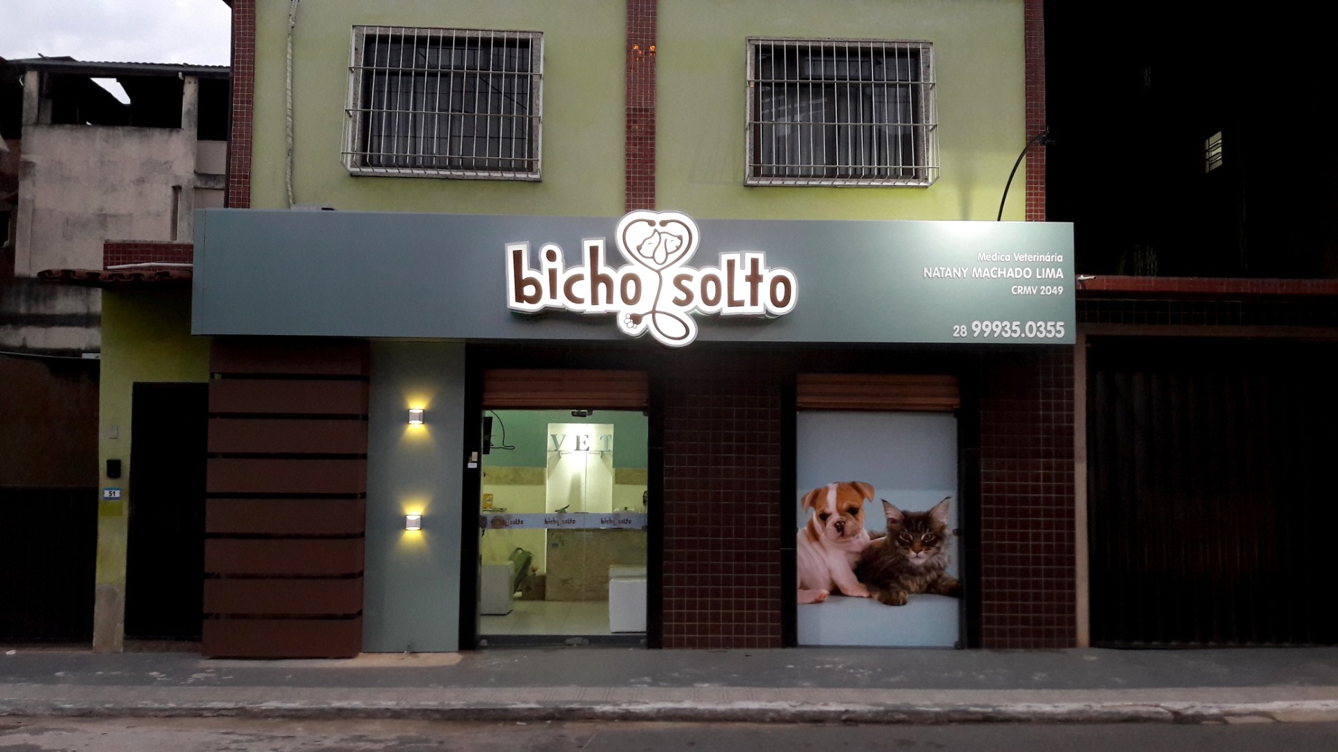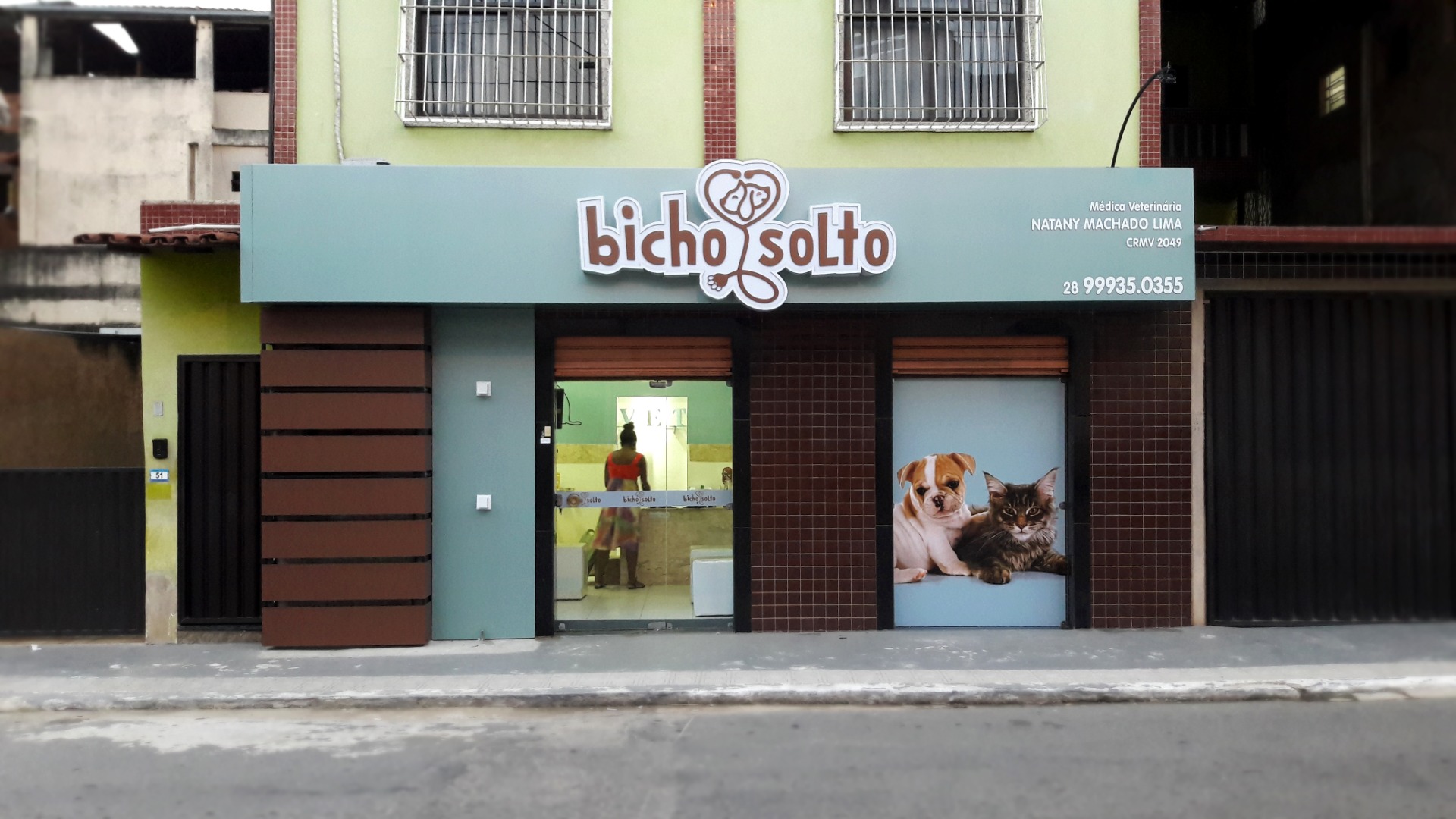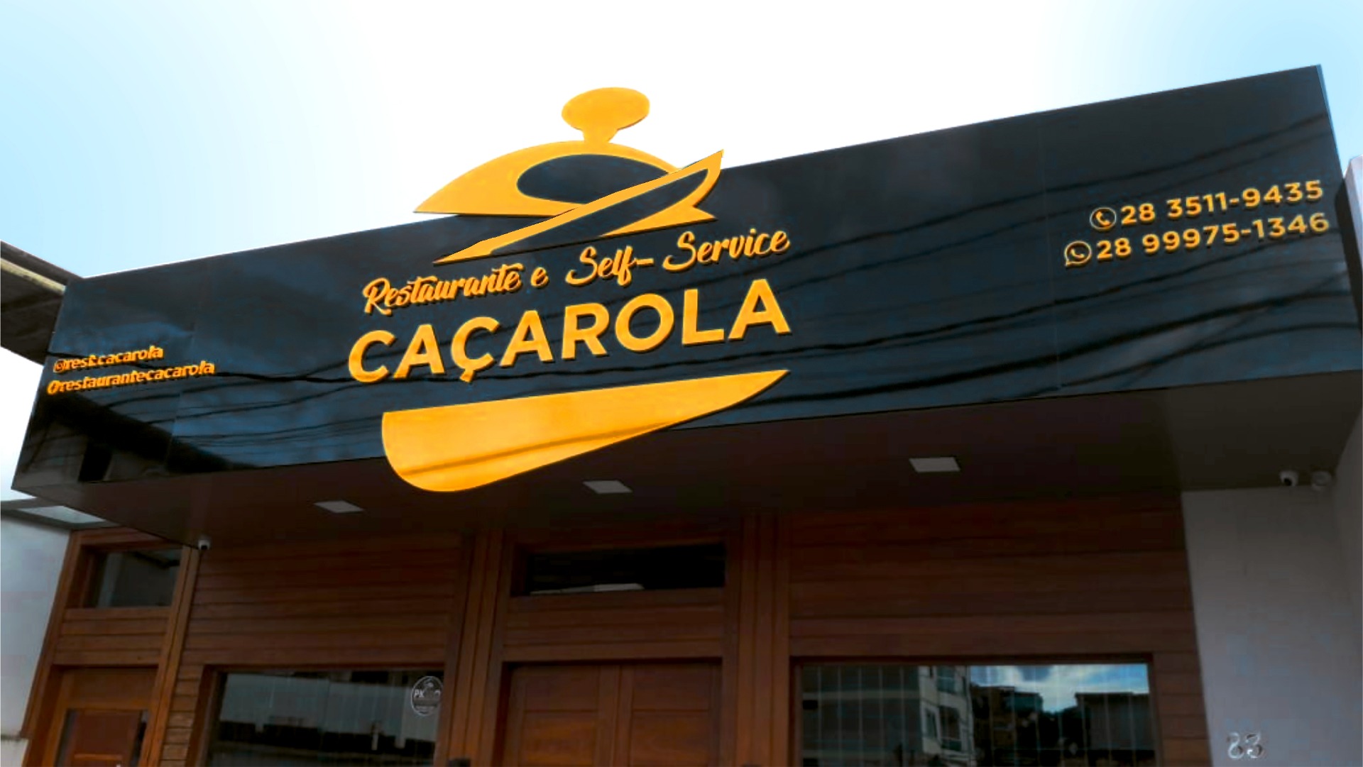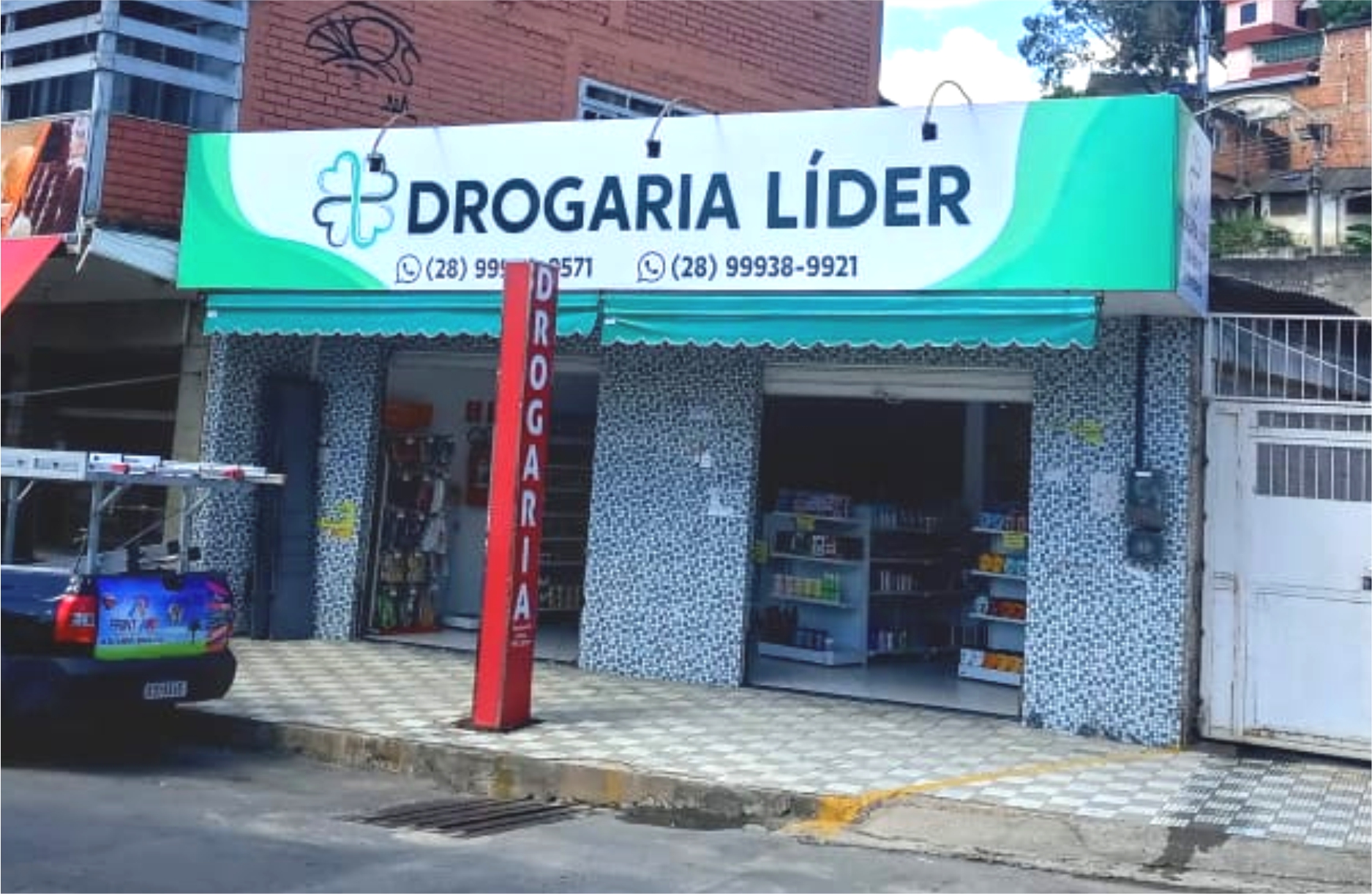 Fachada com painel em ACM e logo em caixa de ACM com iluminação interna. Adesivo fosco no vidro