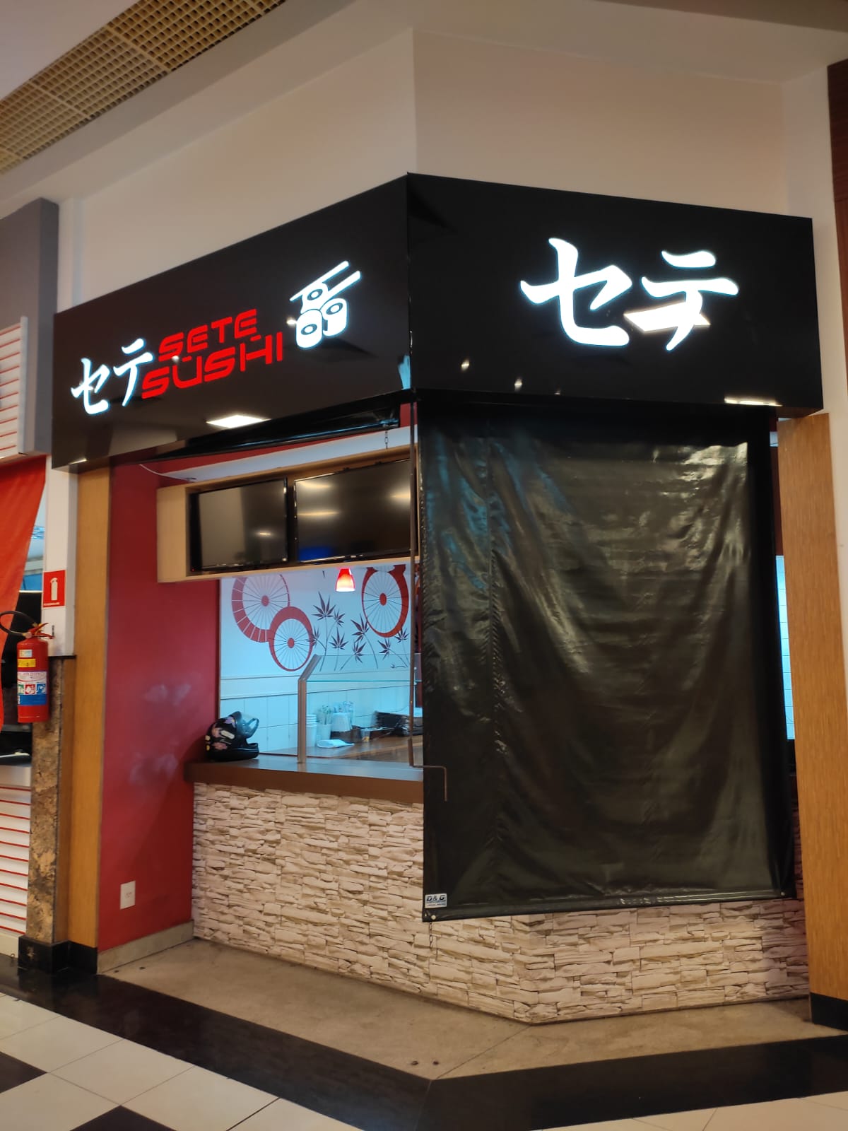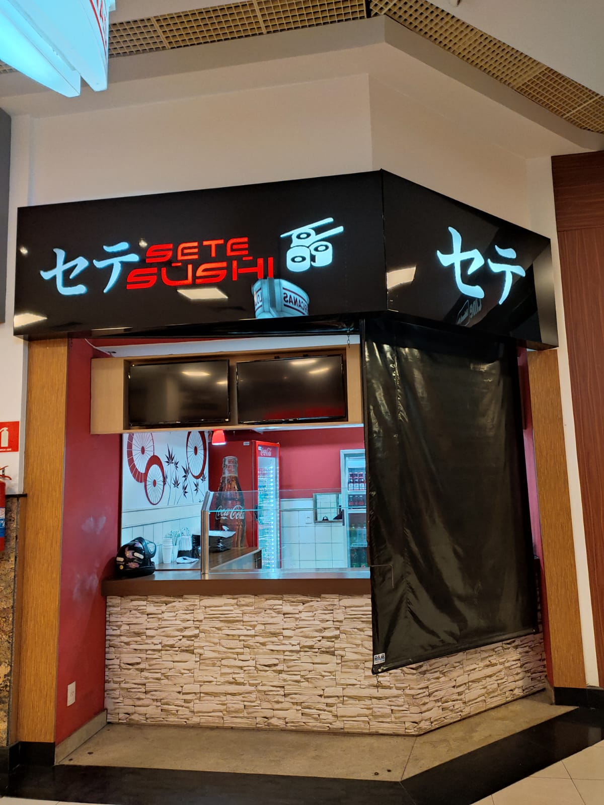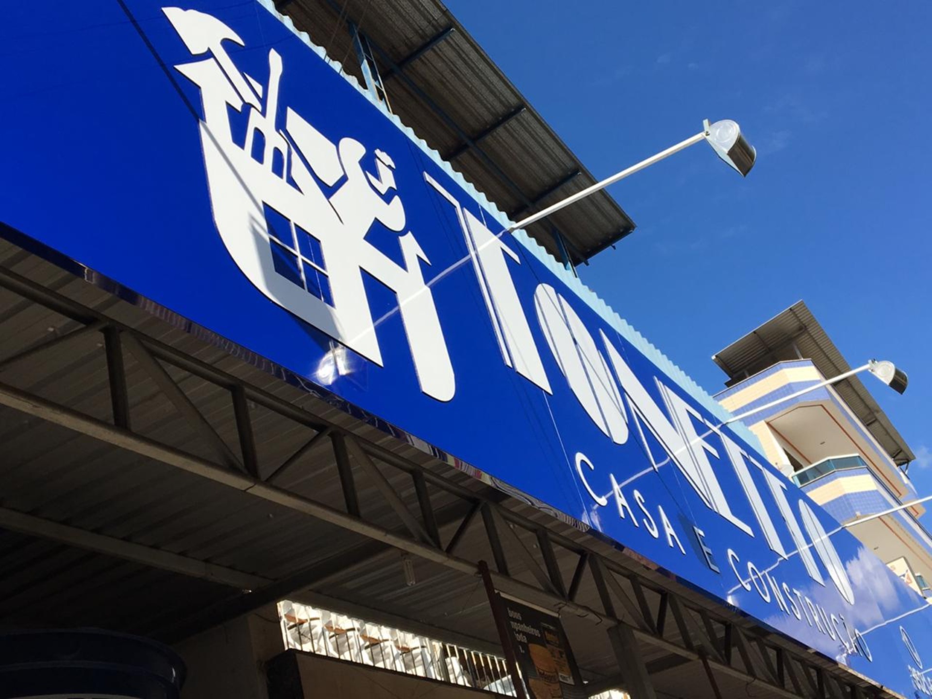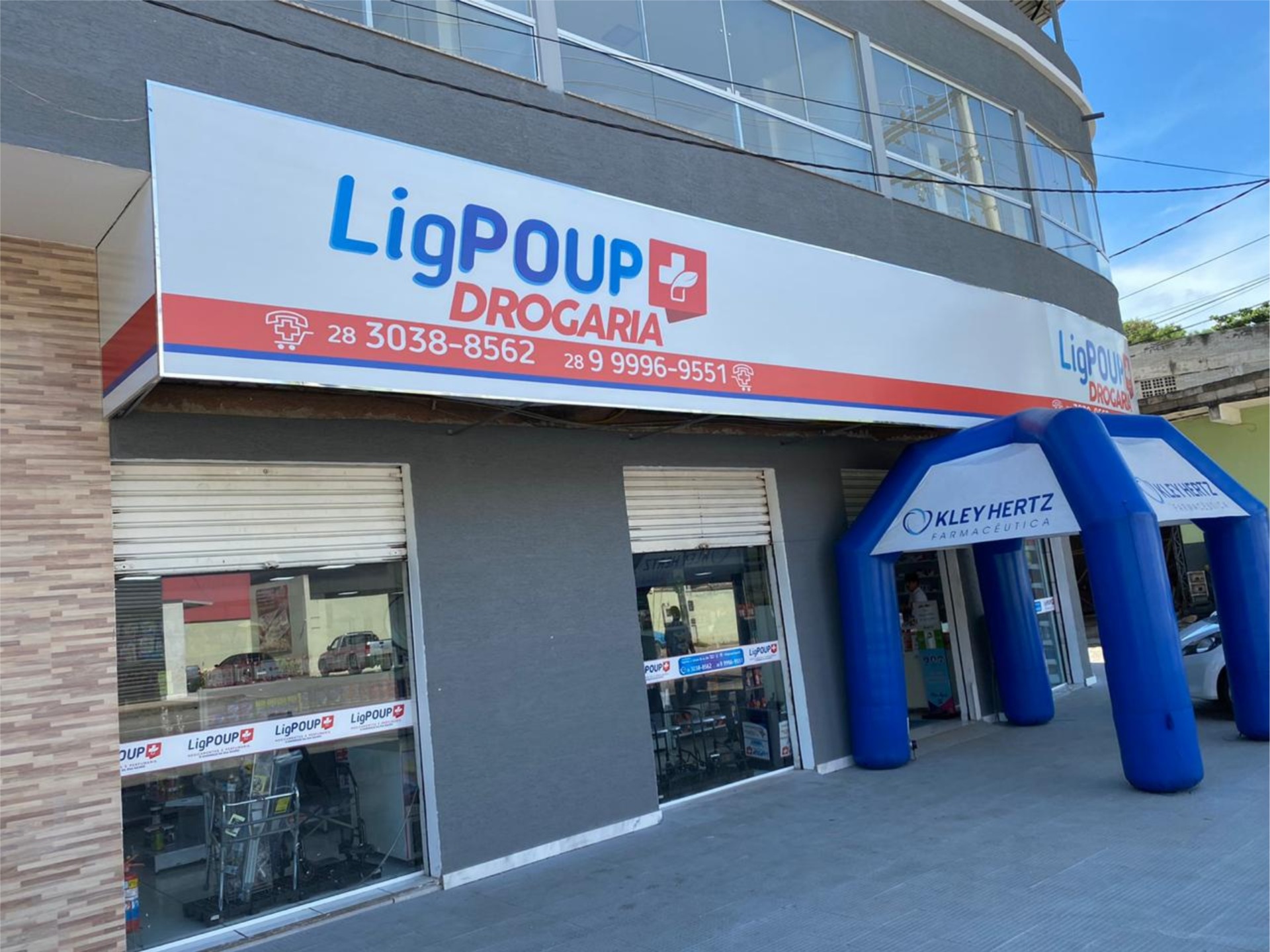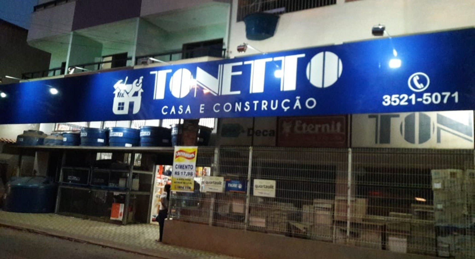 Fachada com painel em ACM e logo em caixa de ACM com iluminação interna. Adesivo fosco no vidro