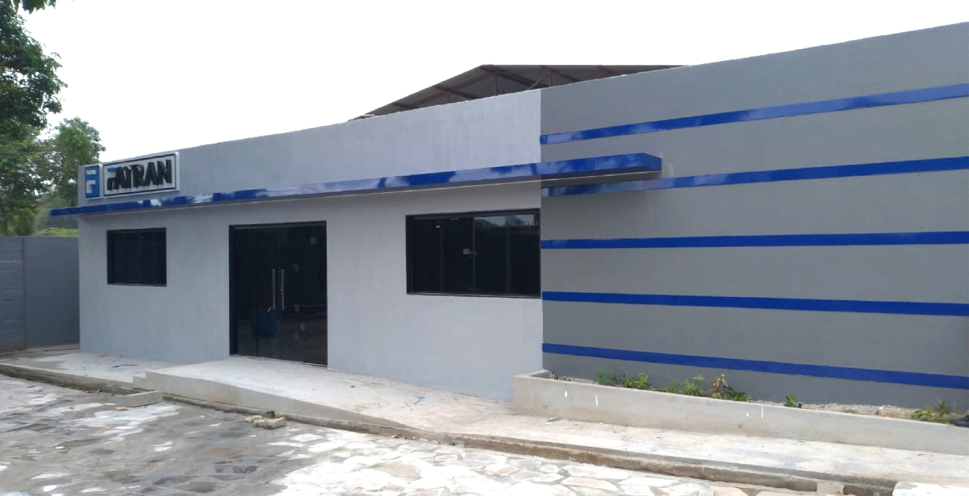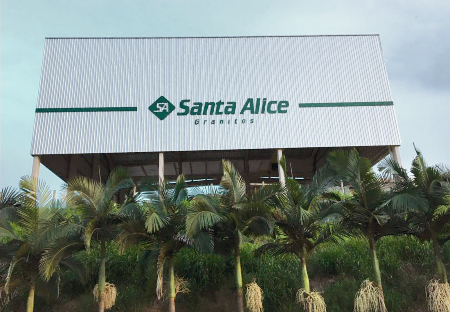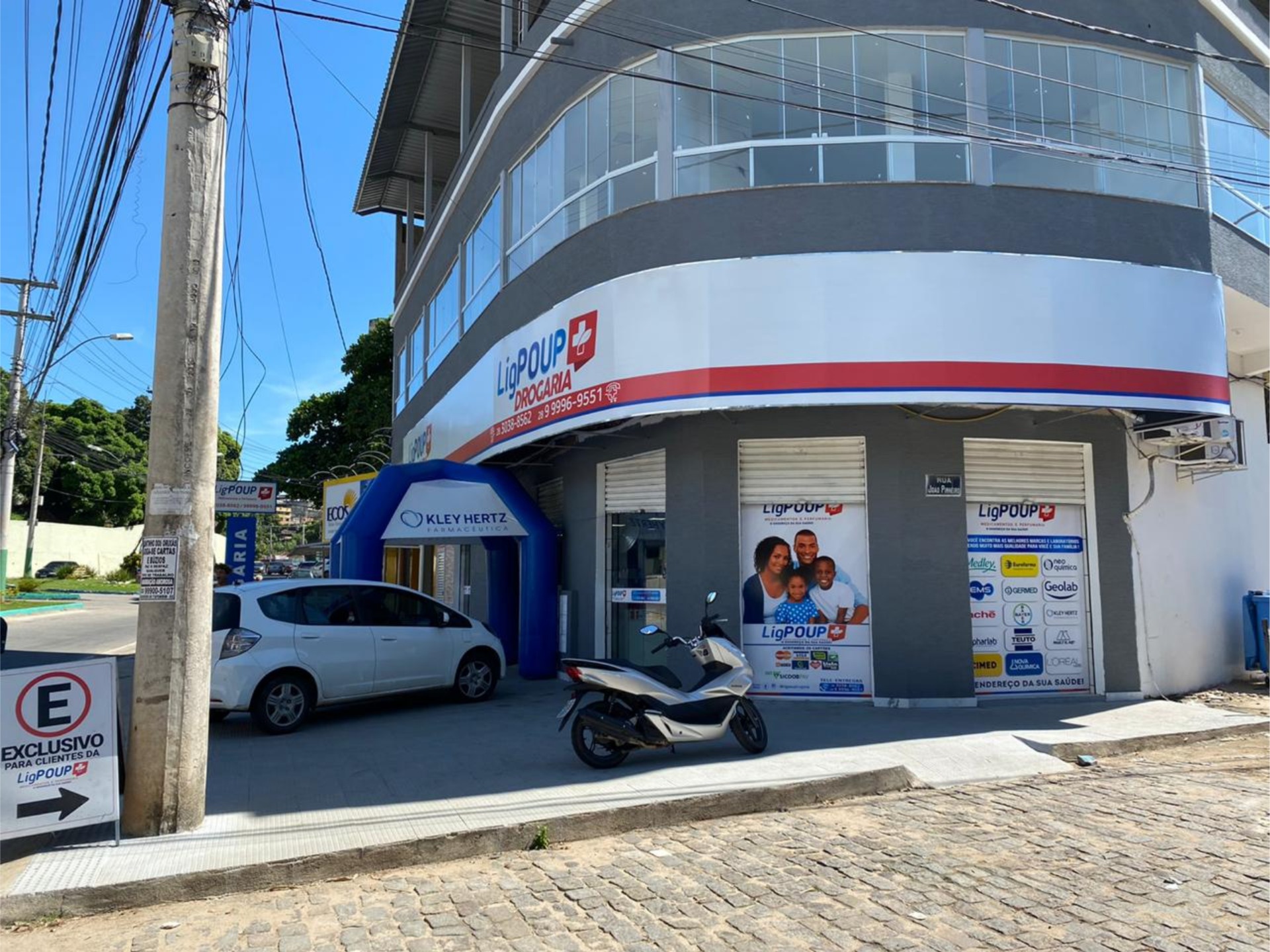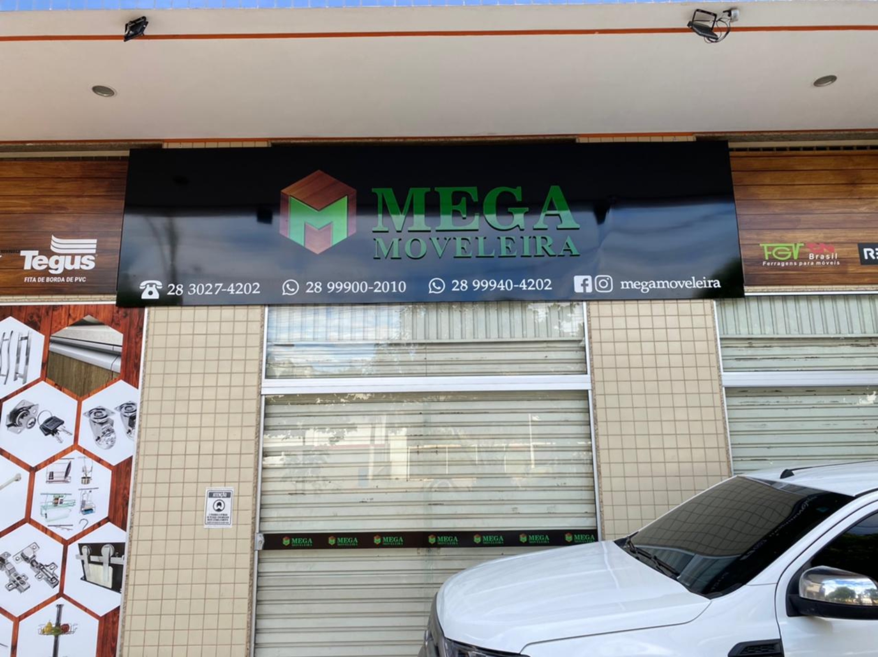Fachada com revestimento em ACM prata e logo em ACM adesivado e placa bandeira