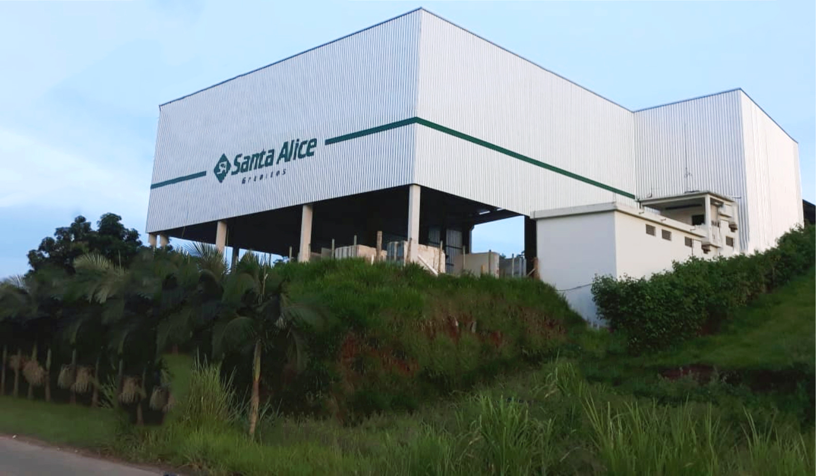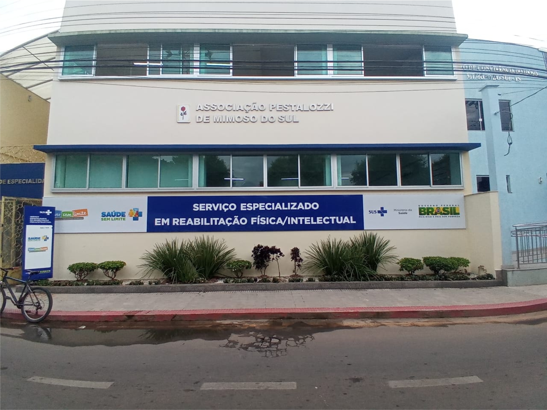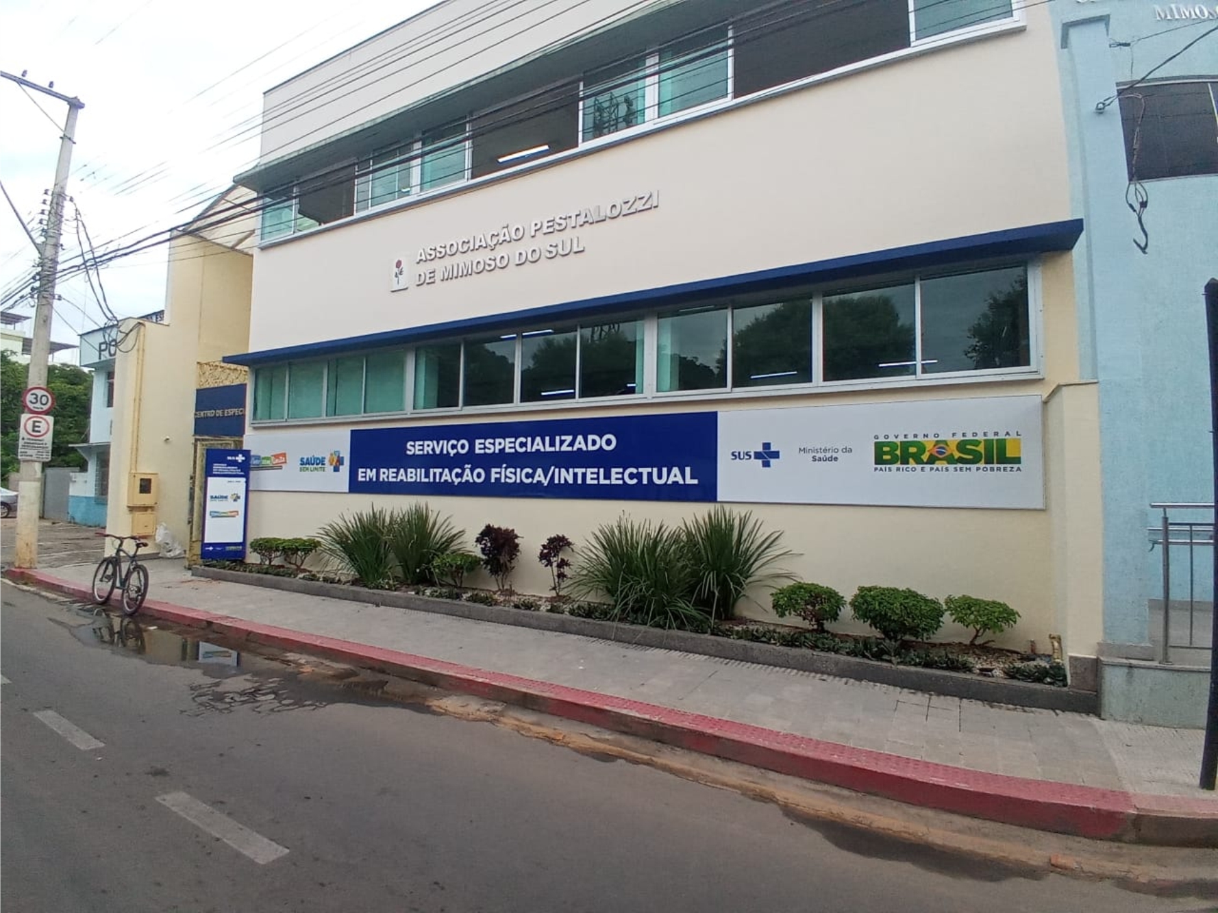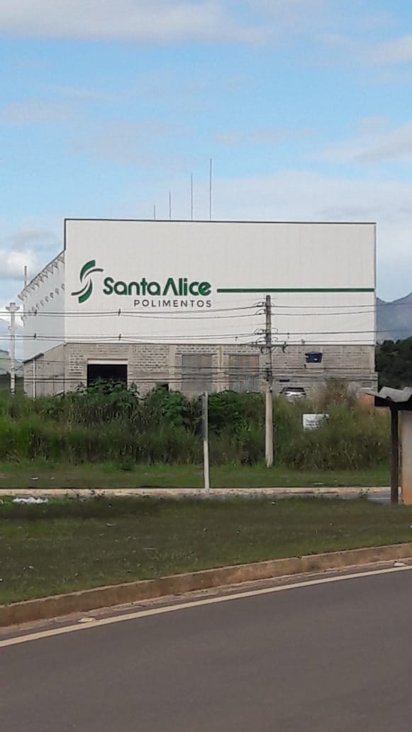 Fachada com revestimento em ACM prata e logo em ACM adesivado e placa bandeira